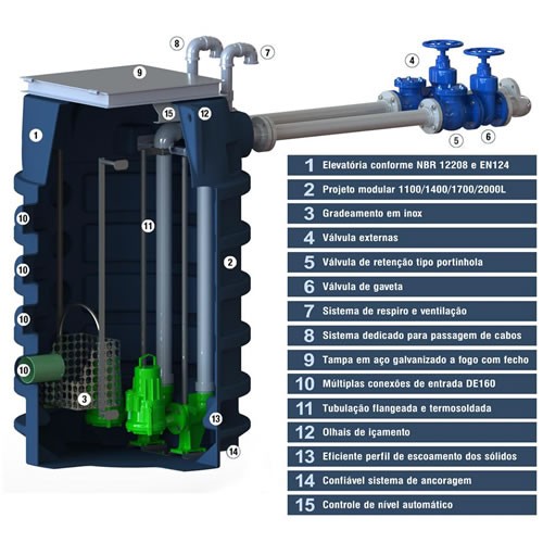 O conjunto vem pré-configurado e pronto para instalação. Como padrão, a elevatória inclui: um tanque em polietileno de alta resistência; uma bomba submersível; tubulações de descarga, válvula e conexões; e dispositivos para acionamento elétrico.